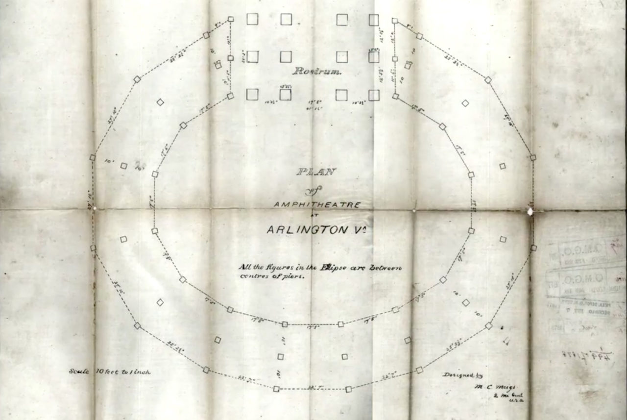 Arlington National Cemetery was established in 1864. Due to the growing importance of the cemetery as well as the much larger crowds attending Memorial Day observances, Brigadier General Montgomery C. Meigs (who was Quartermaster General of the United States Army) decided a formal meeting space at the cemetery was needed. A grove of close-growing trees just southwest of Arlington House Grove was cut down and a wooden amphitheater (today known as the Tanner Amphitheater) constructed in 1873.