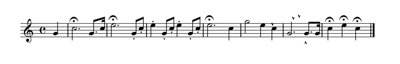 The Taps in this manual has twenty-four notes, but there are rhythmic differences and the inclusion of two extra notes at the end. The call also has articulations of staccato (.), which implies a nonlegato form of single tonguing, and a percussive (v) accent, which implies a stronger attack.